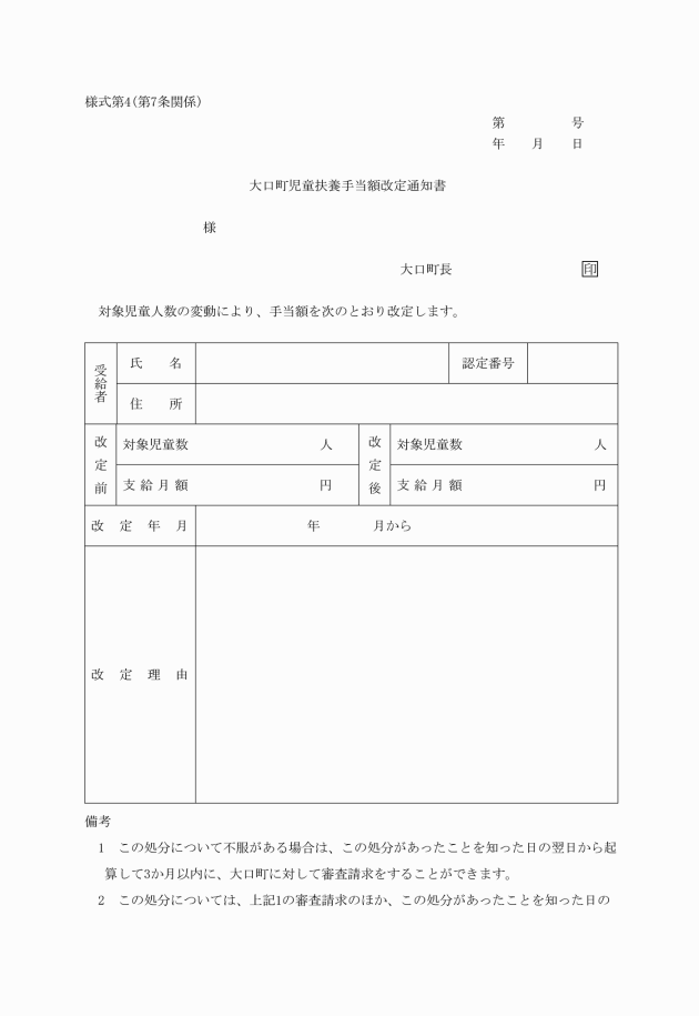 第6条 手当の支給を受ける者(以下「受給者」という。)が、氏名、住所又は支払金融機関を変更したとき、又は変更しようとするときは、速やかに大口町児童扶養手当変更届(様式第3)を町長に提出しなければならない。