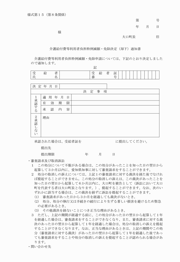 3 町長は、特例適用の可否を決定したときは、介護給付費等利用者負担特例減額・免除決定(却下)通知書(様式第15)により当該決定を受けた者に通知し、特例適用を決定した者には、受給者証の提出を求めるものとする。