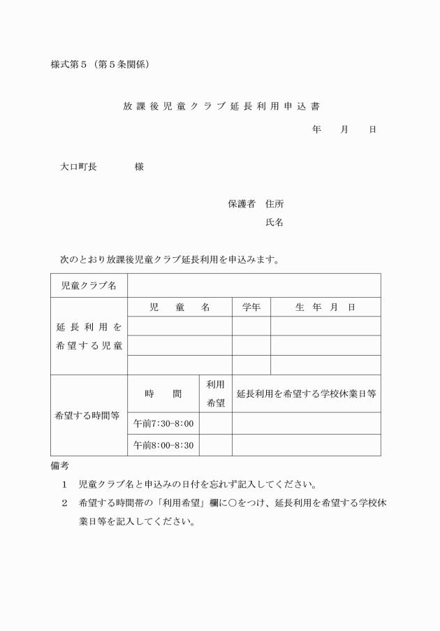 第2条 放課後児童クラブ(以下「児童クラブ」という。)に入会を希望する保護者は、町長に放課後児童クラブ入会申込書(様式第1)を提出しなければならない。